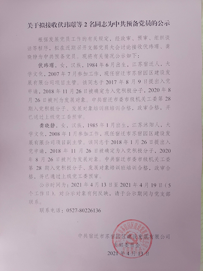 關(guān)于擬接收伏瑋璟等2名同志為中共預(yù)備黨員的公示
